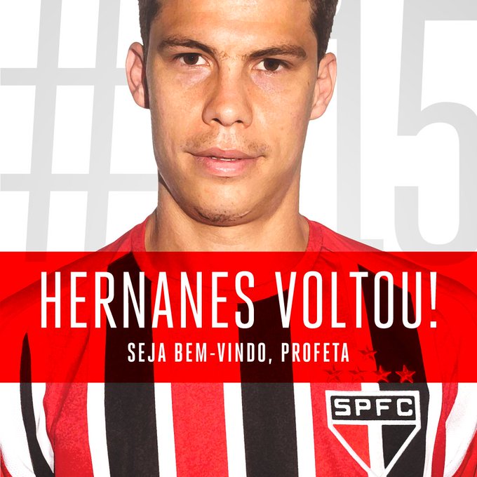 O torcedor do São Paulo acordou com uma baita notícia na manhã desta quarta-feira . O Tricolor anunciou através de suas redes sociais o retorno do meia Hernanes, bicampeão brasileiro pelo clube (2007 e 2008). O experiente jogador de 32 anos estava no chinês Hebei China Fortune.